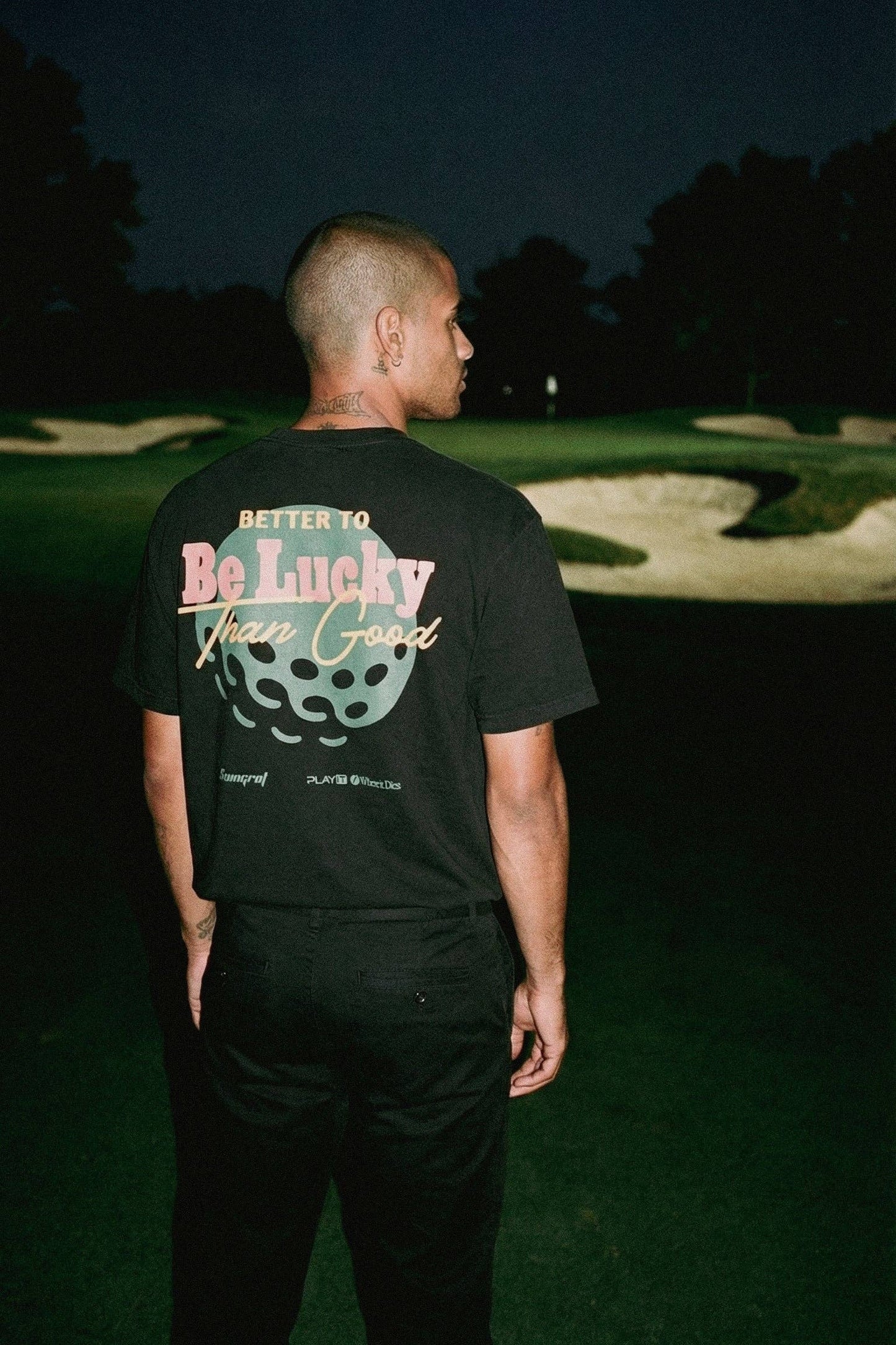 Garment dyed, seamless body crew neck featuring a 'Golf' graphic printed direct to film on the front and back. Unisex sizing.