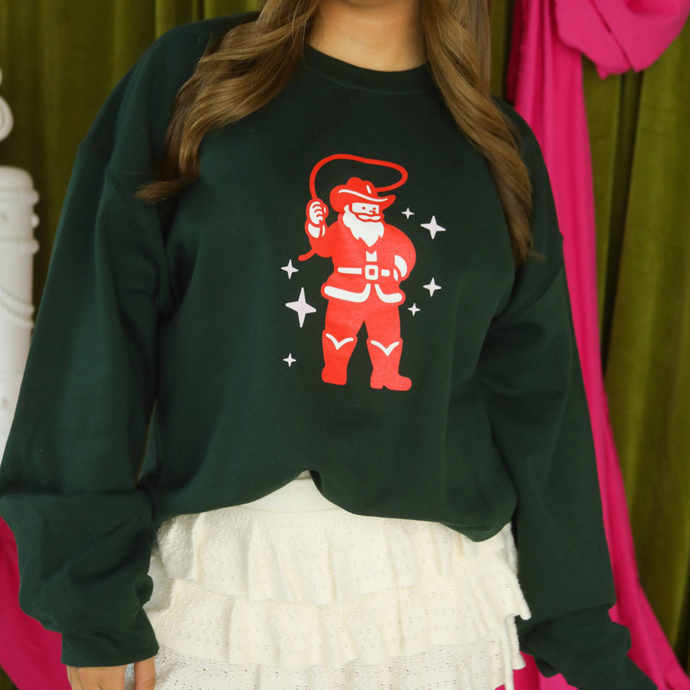 Bring some western charm to your holiday wardrobe. This green crewneck features a playful cowboy Santa with a lasso on the front, and “Santa, I Want a Cowboy” in rope-style font on the back.
